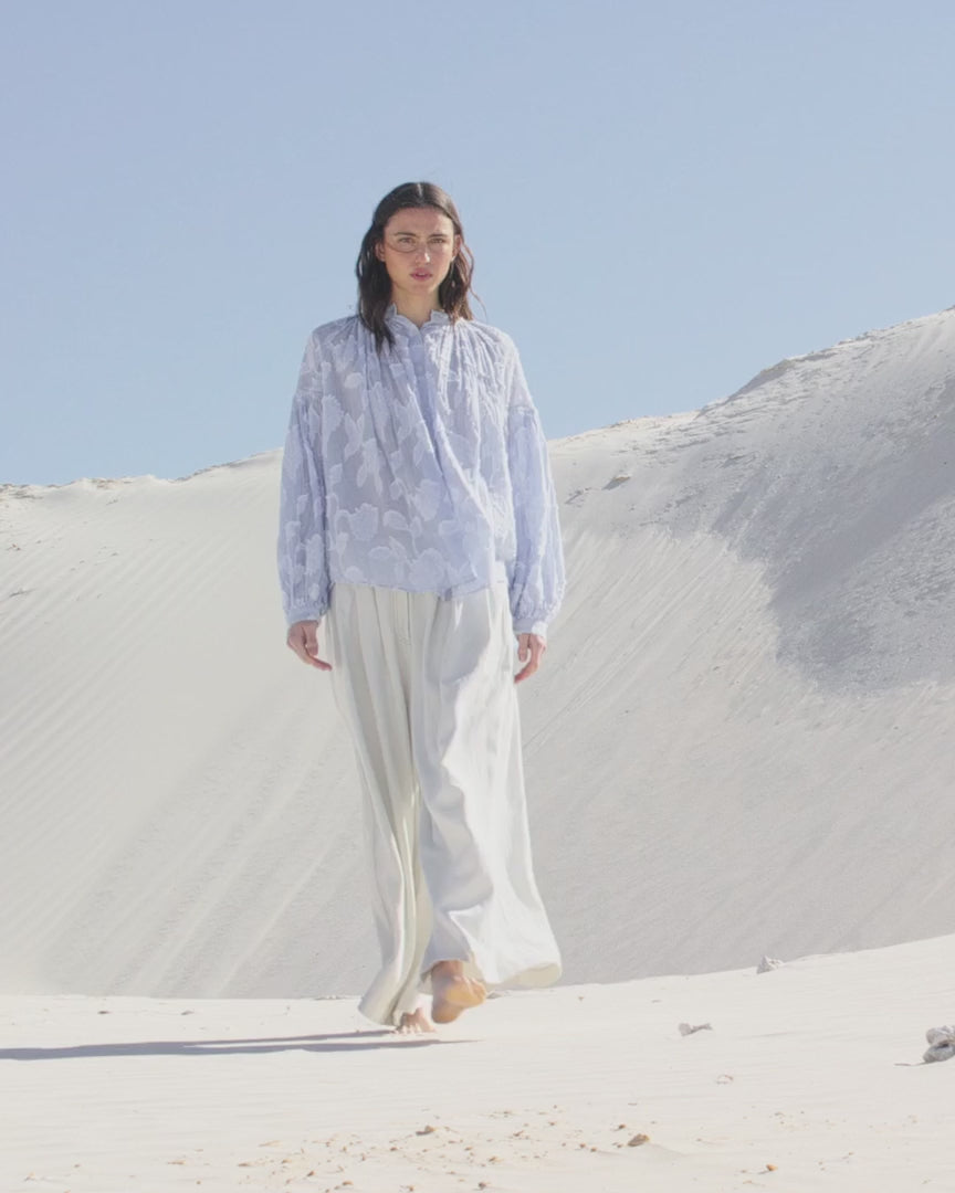 Jacquard cotton blouse on a striped sky-blue background, enhanced by delicate clipped threads forming a white leaf pattern, adding a natural and airy touch. Its soft and generous volume drapes the silhouette fluidly, while its wide sleeves bring a bohemian elegance. The open-front design allows for layering, giving this piece a look that is both relaxed and refined.